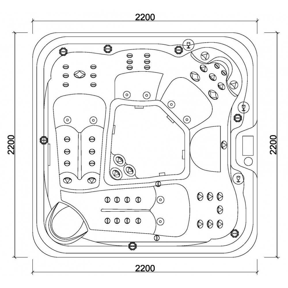 Trysky: 45 ks hydromasážních, 8 ks blower, 6 ks AIR X (celkem 59 ks)